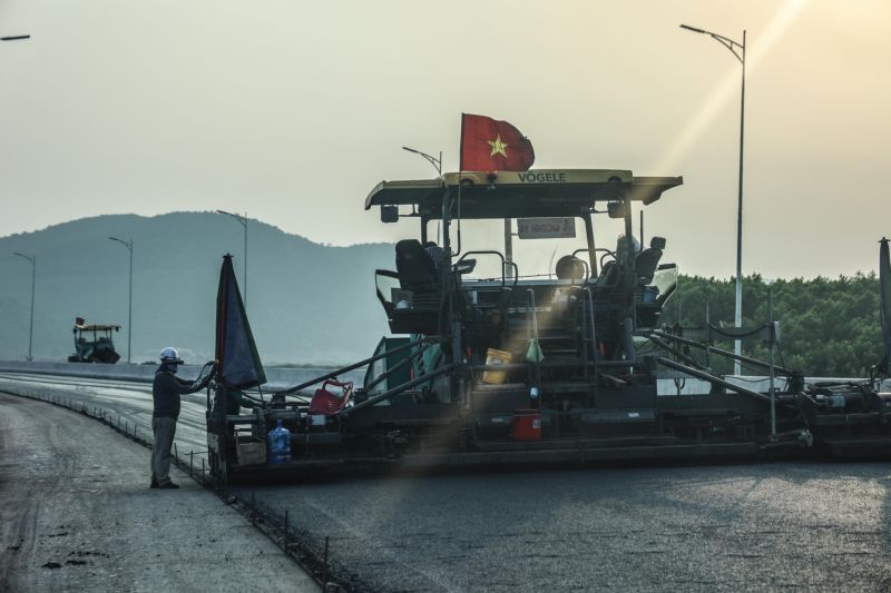Đơn vị thi công thảm lớp bê tông nhựa cuối cùng mặt đường dẫn lên cầu Vân Tiên.