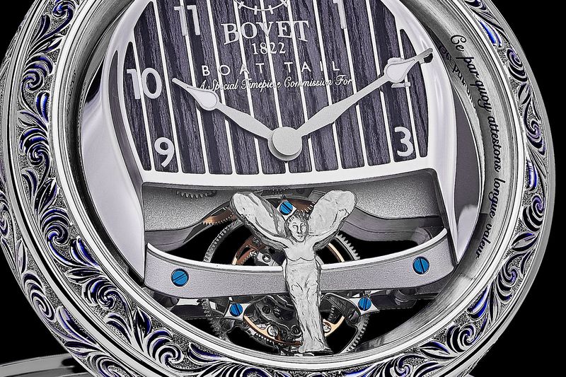 Cả hai mặt số phía sau đều được trang trí bằng các tác phẩm điêu khắc Bespoke hình chiếc Boat Tail. Các họa tiết này được thực hiện hoàn toàn bằng tay, khắc hoạ hoàn chỉnh các chi tiết bánh xe, tay nắm cửa, gương và các chi tiết tinh xảo khác. Đội ngũ của Rolls-Royce và BOVET 1822 đã hợp tác chặt chẽ với nhau để đảm bảo lớp sơn mài của tác phẩm nghệ thuật này mang màu ton sur ton với chiếc động cơ ô tô cỡ lớn.