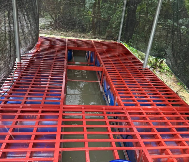 Chiếc bè được gia cố bằng các thanh trụ cắm sâu xuống đất, cho phép bè tự nổi theo mực nước nhưng không trôi đi hoặc lật nghiêng. Trên bè còn có mái che và lớp bạt phủ để giảm ảnh hưởng của mưa gió.