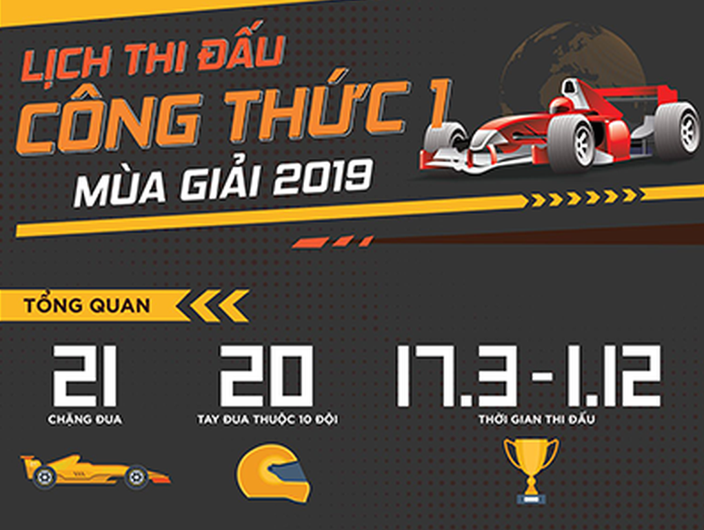 Năm nay, có tổng cộng 21 chặng thi đấu trải dài từ Đông sang Tây ở 4 châu lục trên thế giới. Chặng đua gần nhất với Việt Nam chính là chặng thứ 15 diễn ra trên đường phố Singapore vào ngày 22/9. Ngoài ra, chặng đua tại Trung Quốc (ngày 14/4) sẽ là chặng đua Grand Prix thứ 1.000 trong lịch sử Formula One, một cột mốc đáng nhớ.