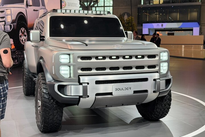 Mẫu concept off-road Hyundai Boulder gây chú ý lớn tại sự kiện. Đây là bản xem trước cho hai dòng xe khung rời hãng dự kiến ra mắt trước cuối thập kỷ. Thiết kế mang dáng vẻ vuông vức nhưng được xử lý mềm mại hơn khi quan sát kỹ. Cụm đèn hậu phát sáng đỏ, phản chiếu ánh hồng lên thân xe bạc tạo hiệu ứng thị giác đặc biệt. Phiên bản thương mại dự kiến là bán tải cỡ trung.