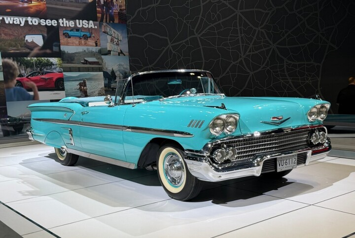 Bên cạnh xe mới, triển lãm còn trưng bày mẫu Bel Air Impala 1958. Xe có màu Tropic Turquoise đặc trưng, động cơ V8 công suất 280 mã lực. Khi ra mắt, mẫu xe này có giá chỉ 2.841 USD (khoảng 74,8 triệu đồng), phản ánh thời kỳ vàng son của ngành ô tô Mỹ với chi phí sở hữu thấp hơn nhiều so với hiện nay.