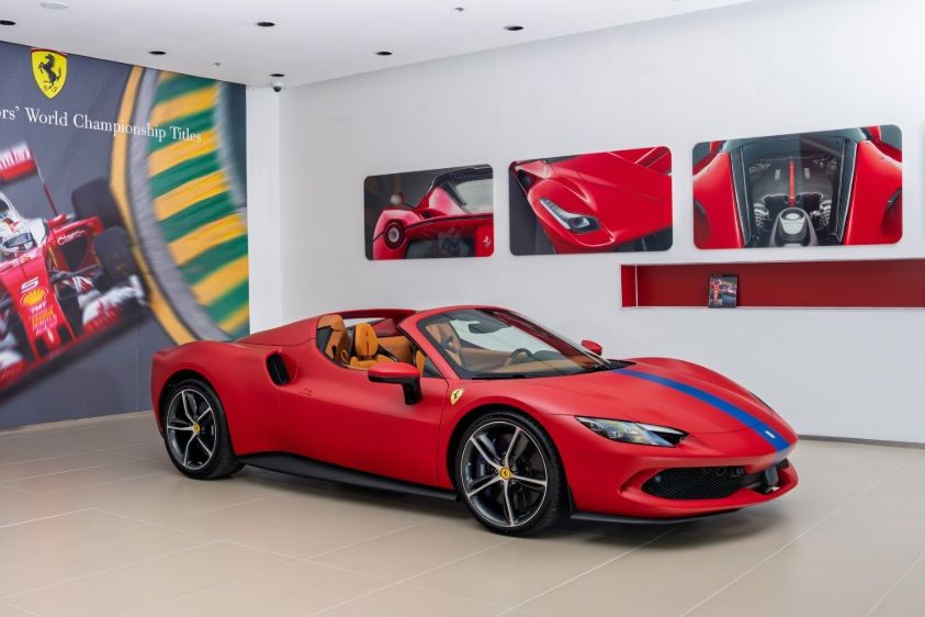 Ở phân khúc siêu xe thể thao, tâm điểm chú ý thuộc về Ferrari với sự xuất hiện của Ferrari 296 GTS phiên bản mui trần. Dù giá bán cụ thể không được công bố, mẫu xe này có giá khởi điểm từ khoảng 23 tỷ đồng chưa bao gồm các tùy chọn cá nhân hóa. Chiếc xe tại Việt Nam gây ấn tượng mạnh nhờ màu sơn Rosso F1-75 Opaco dạng nhám, lấy cảm hứng từ xe đua F1 mùa giải 2022, kết hợp sọc Blu Corsa chạy dọc thân xe - cấu hình được đánh giá là cực kỳ hiếm trên toàn cầu.