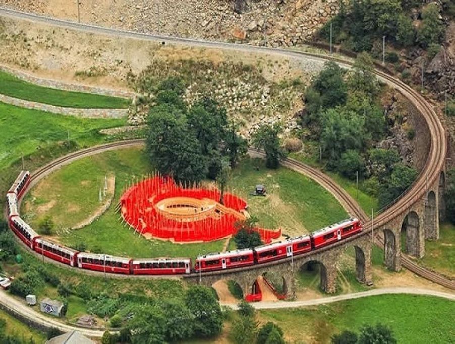 Tàu chạy dọc cầu cạn Brusio (Thụy Sỹ): Brusio là cầu cạn hình xoắn ốc, có 9 vòm được xây dựng để cho tàu có thể đạt tốc độ nhanh trong quãng đường ngắn. Cầu có chiều dài 110m, có độ cong ngang 70m, độ dốc dọc 7%, và chín khoảng kéo dài 10m. Cầu cũng là một phần của tuyến đường sắt Bernina giữa Brusio và Campascio, và cách St Moritz khoảng 55km. (Nguồn: Oddee)