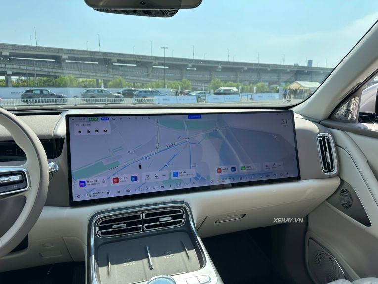 Điểm nhấn thu hút khách hàng công nghệ trên M9 chính là hệ thống màn hình dày đặc. Ngoài bảng đồng hồ 12,66 inch và màn hình HUD cho người lái, xe sở hữu một màn hình khổng lồ 30 inch trải dài ở mặt táp-lô.