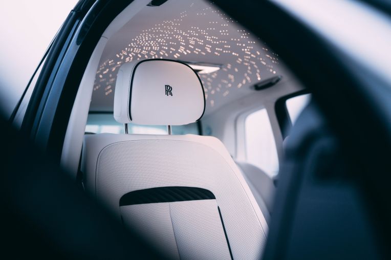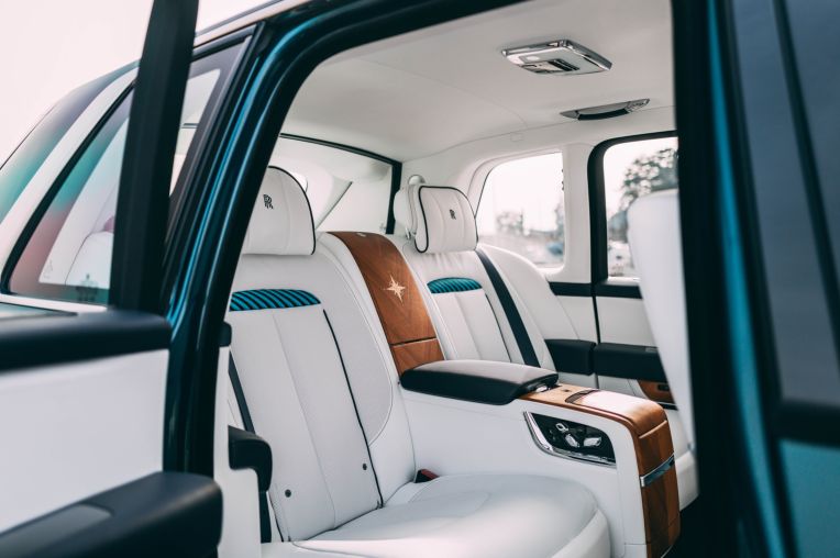 Sự tỉ mỉ còn được thể hiện qua họa tiết la bàn khảm từ hơn 40 mảnh gỗ veneer khác nhau như gỗ phong, gỗ tro và gỗ Bolivar đen tại khu vực vách ngăn phía sau. Ghế ngồi của xe bọc da trắng Arctic và xanh Navy, điểm xuyết bằng các đường thêu mô phỏng nút thắt dây thừng của Hải quân Hoàng gia.