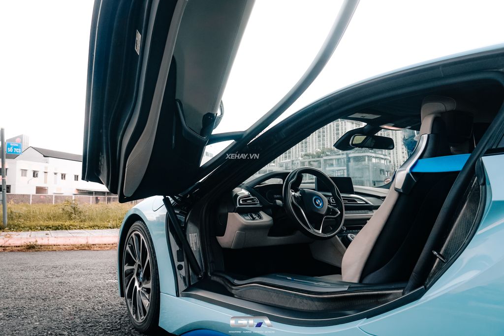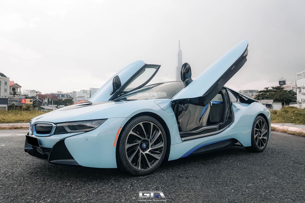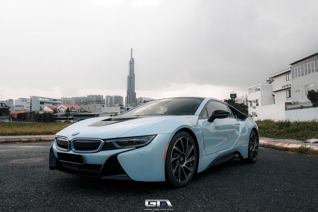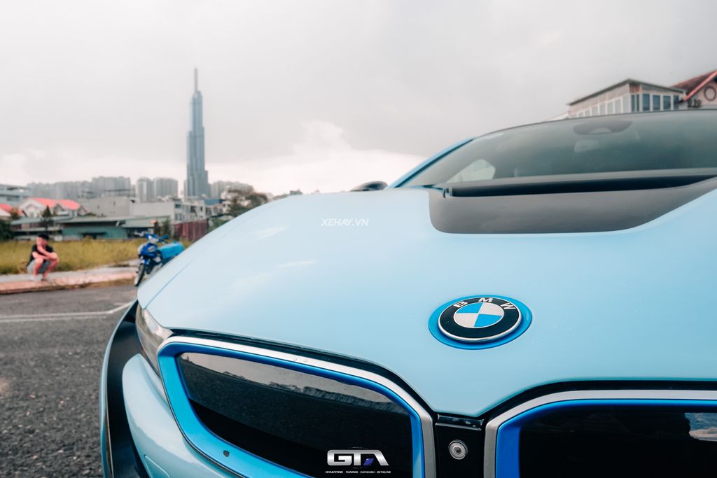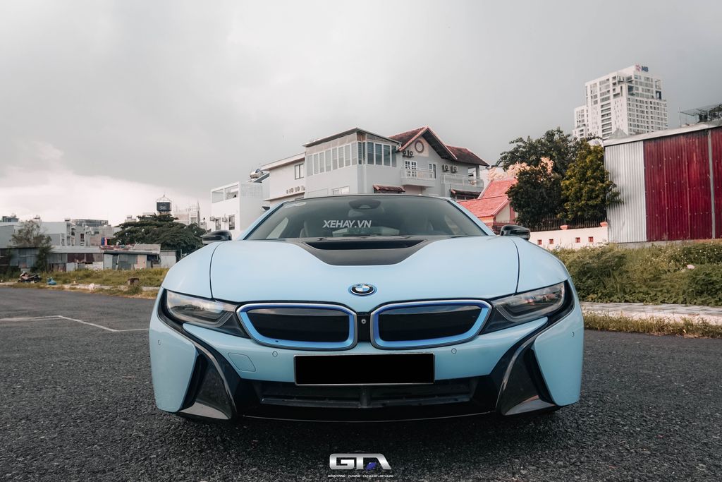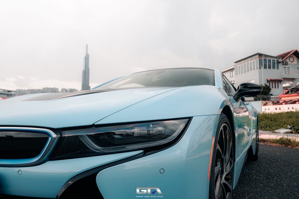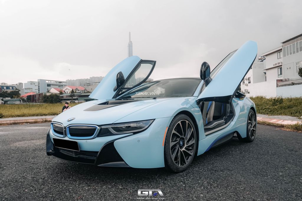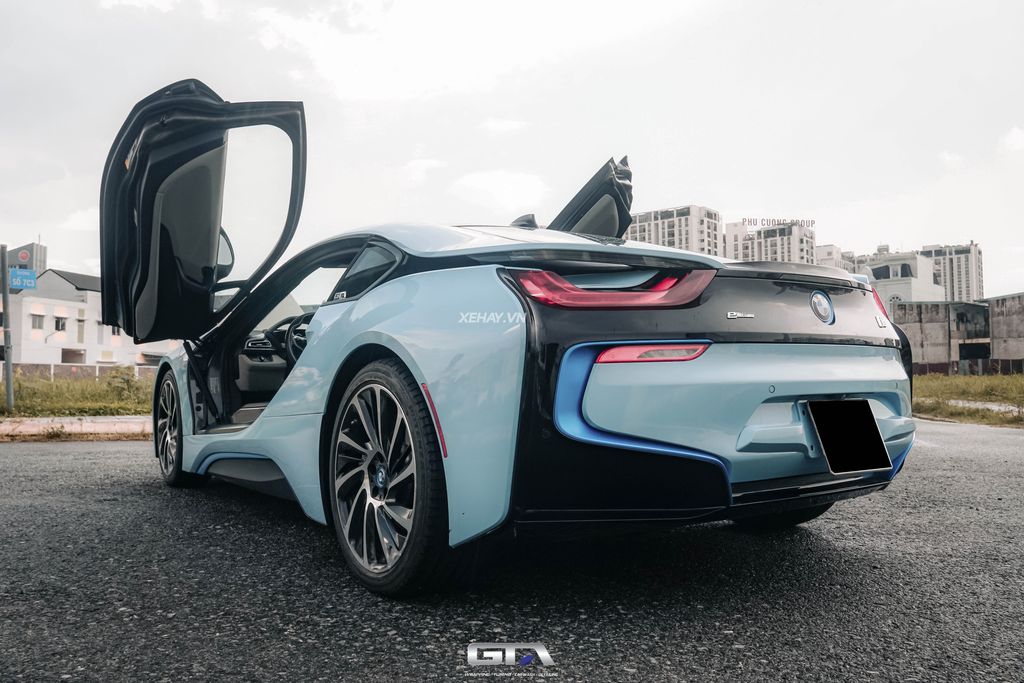 Vào thời điểm năm 2015, BMW i8 từng là “cơn sốt” đối với giới chơi xe Việt Nam khi liên tục được đưa về nước với những màu sắc khác nhau như: xám bút chì, trắng, xanh ngọc bích, bạc,... . Điểm nhấn đáng chú ý của chiếc BMW i8 trong bài là màu sơn ngoại thất xanh da trời - Sea Breeze Blue. Thực tế, đây không phải là màu sơn nguyên bản của xe, chiếc BMW i8 này đã được chủ nhân cho đi "thay áo" bằng phương pháp dán decal. BMW i8 vốn có thiết kế khá cá tính, thể thao và khi được khoác trên mình “bộ cánh” màu xanh này, chiếc xe trở nên “dịu dàng, nhẹ nhàng” hơn rất nhiều. Được biết, xe được dán đổi màu và lên ý tưởng tại GTA Wrapping.