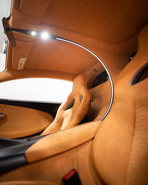 Di chuyển vào bên trong, phần lớn cabin xe được bọc Alcantara mềm mại, bao gồm đệm ghế, bệ tì tay trung tâm, nửa dưới bảng điều khiển trung tâm, các tấm cửa và vô lăng. Kết hợp cùng Alcantara màu tan là da màu tan và một số chi tiết trang trí bằng nhôm và điểm nhấn bằng sợi carbon mờ, mang đến không gian ấm cúng mà vẫn vô cùng sang trọng.