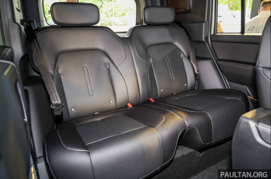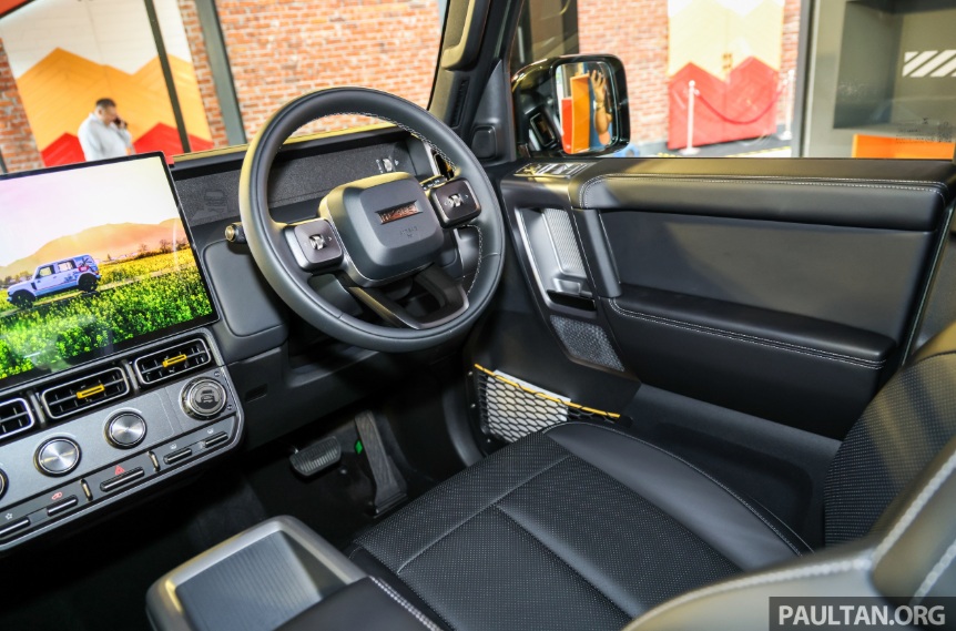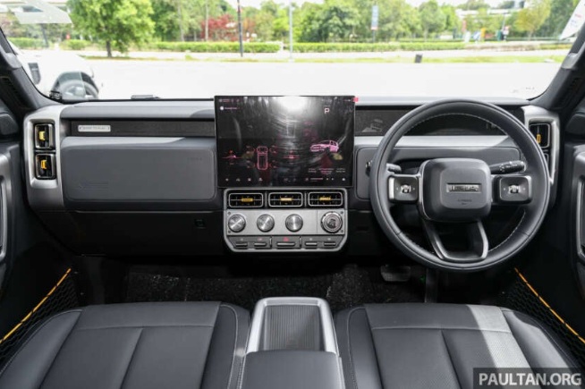 Bên trong khoang cabin, iCaur V23 đi ngược lại xu hướng loại bỏ phím bấm vật lý. Hãng vẫn giữ lại các núm xoay và phím chức năng để người lái dễ dàng thao tác khi đi địa hình, bên cạnh màn hình trung tâm khổng lồ 15,4 inch. Trang bị tiện nghi trên xe cũng rất hào phóng với ghế bọc da chỉnh điện tích hợp thông gió, dàn âm thanh 7 loa, kết nối Apple CarPlay/Android Auto không dây.