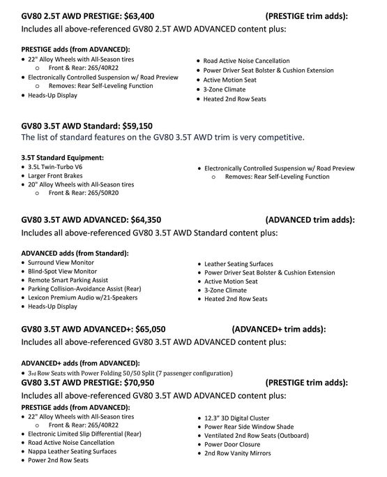 Nếu không xét tới các cấp trang bị, một trong những đối thủ với nhiều tiện ích nhất trong phân khúc chính là chiếc Mercedes-Benz GLE 350, sử dụng động cơ 4 xi-lanh 255 mã lực, kèm mức giá bán 54.250 USD (1,26 tỷ VNĐ) cho phiên bản RWD và 56.750 USD (1,31 tỷ VNĐ) cho biến thể AWD – những con số cao hơn nếu so với GV80. Tuy nhiên, GV80 V6 lại trở nên kém cạnh tranh khi đặt cạnh chiếc Mercedes-Benz GLE 450 4MATIC sử dụng động cơ I6 362 mã lực với mức giá chỉ từ 61.750 USD (1,43 tỷ VNĐ) hay người anh em AMG GLE 43 với động cơ V6 385 mã, đi kèm với mức giá 68.150 USD (1,58 tỷ VNĐ). Còn BMW X5 chỉ cung cấp phiên bản động cơ I6 và V8, với giá khởi điểm từ 58.900 USD (1,36 tỷ VNĐ) cho biến thể sDrive40i RWD 335 mã lực và 61.200 USD (1,42 tỷ VNĐ) cho chiếc xDrive40i.