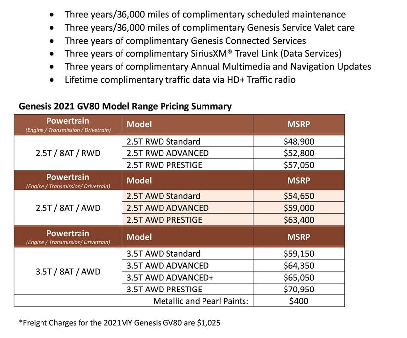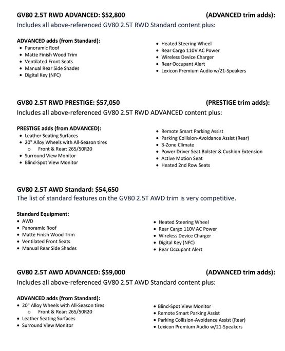 Cụ thể hơn, phiên bản GV80 hoàn toàn mới sẽ cập bến các đại lý Genesis tại Mỹ từ mùa hè này với mức giá khuyến nghị của nhà sản xuất khởi điểm từ 48.900 USD (tương đương 1,13 tỷ VNĐ), chưa bao gồm 1.205 USD (gần 28 triệu VNĐ) phí vận chuyển. Như vậy để sở hữu chiếc SUV hạng sang đến từ Hàn Quốc này, khách hàng sẽ phải bỏ ra khoảng 50.105 USD (1,16 tỷ VNĐ), chưa bao gồm phí thuế.