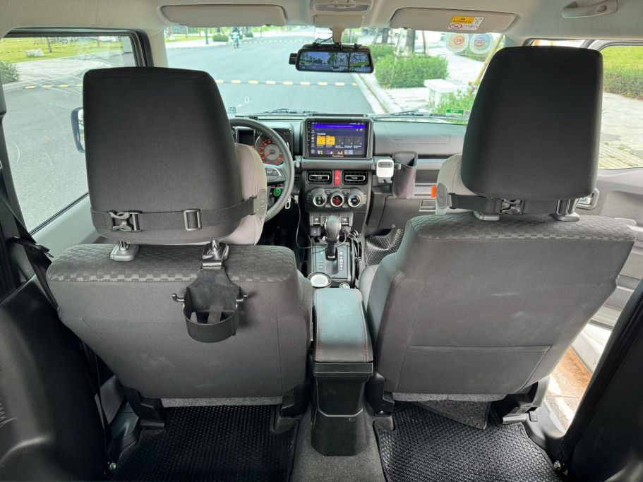 Khoang lái của Jimny được thiết kế theo hướng tối giản và thực dụng. Xe sở hữu các trang bị tiện ích như: màn hình cảm ứng trung tâm kích thước 9 inch, hỗ trợ kết nối Apple CarPlay và Android Auto. Các trang bị còn lại khá cơ bản như ghế nỉ, phanh tay cơ, điều hòa chỉnh tay, gương chiếu hậu chỉnh cơ và không có cửa gió cho hàng ghế sau.