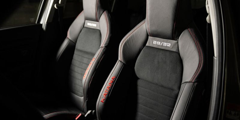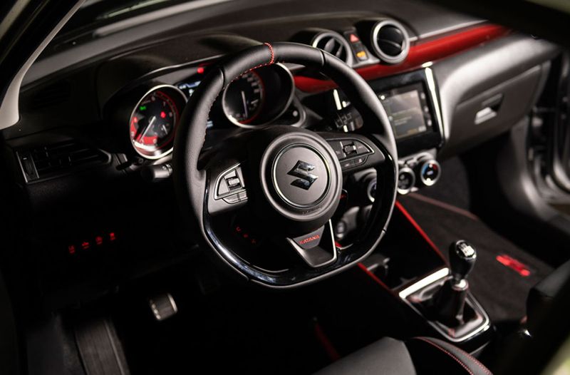 Phía trong Suzuki Swift Sport Katana cũng được nâng cấp với ghế da, trang trí độc quyền ở cửa, thảm trải sàn, thềm xe giả sợi carbon, đặc biệt huy hiệu Katana được đặt ở vị trí vô lăng và xuất hiện trên ghế ngồi.