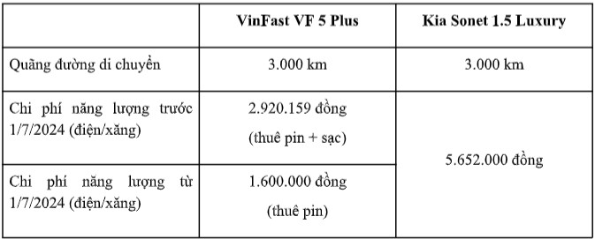 So sánh chi phí nhiên liệu VF 5 Plus và Kia Sonet ở mức 3.000 km/tháng. Giá sạc điện tại trạm sạc công cộng: 3.858 đồng/kWh (trước 1/7/2024). Giá xăng RON 95-III: 23.550 đồng (điều chỉnh ngày 4/7/2024).