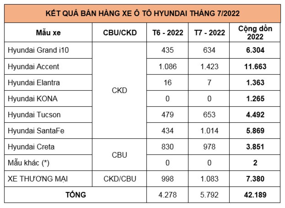 Hyundai Accent tiếp tục là mẫu xe có số lượng bán hàng tốt nhất tháng 7 với 1.423 xe đến tay khách hàng, tăng 31% so với tháng 6/2022. Hyundai Santa Fe đứng ở vị trí thứ 2 với 1.014 xe bán ra, tăng trưởng 133,6% so với tháng trước đó. Hyundai Creta tiếp tục giữ phong độ ổn định với 978 xe bán ra, tăng 17,8% so với tháng 6. Các mẫu xe thương mại đạt doanh số tốt với 1.083 xe bán ra, tương ứng với mức độ tăng trưởng 8,5%.