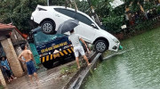 Không rõ vì sao chiếc Hyundai Accent lại bị lao xuống ao, hiện xe đã được trục vớt và đem đi sửa chữa.