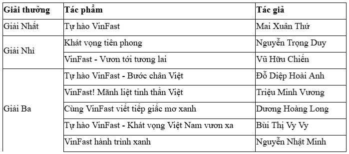 Giải Nhất của Cuộc thi sáng tác ca khúc “VinFast - Khát vọng vì Việt Nam Xanh và Hùng cường” đã được trao cho tác phẩm “Tự hào VinFast” của tác giả Mai Xuân Thứ. Đây là ca khúc được viết trên nền nhạc sôi động, hiện đại, thể hiện sức sống căng tràn của một thương hiệu trẻ và cá tính. Đặc biệt, phần ca từ đầy ý nghĩa như lời chào từ một Việt Nam tươi mới gửi đến thế giới thông qua hình ảnh những chiếc xe VinFast phong cách, đẳng cấp, tượng trưng cho trí tuệ Việt đang song hành cùng thế giới.