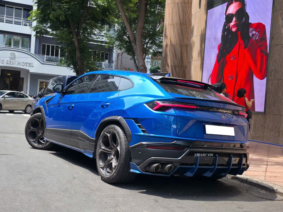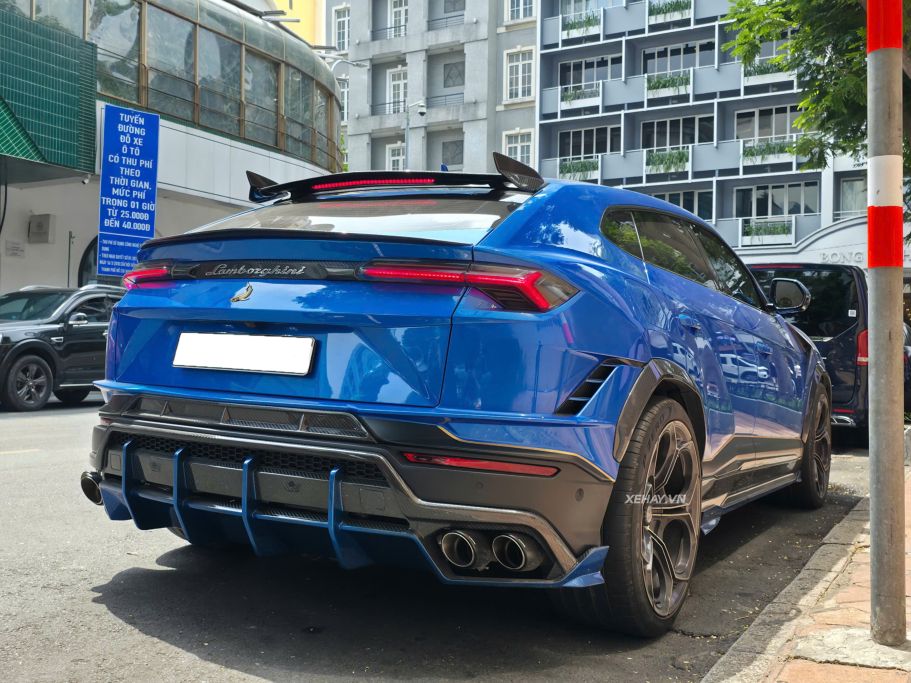 Thay vì giữ thiết kế nguyên bản của dòng SUV hiệu suất cao, chủ nhân chiếc Urus S tại TP.HCM đã quyết định "mạnh tay" đầu tư gói độ ngoại thất từ TopCar Design. Toàn bộ hệ thống cản trước và cản sau được thay thế bằng chất liệu sợi carbon siêu nhẹ, đi kèm với logo nhận diện đặc trưng của hãng độ xứ Bạch Dương.