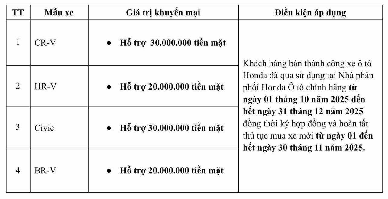 Nhằm cung cấp tới Quý khách hàng phương án giao dịch xe ô tô đã qua sử dụng minh bạch, thuận tiện, Honda Việt Nam đã triển khai Chương trình “Hỗ trợ siêu hời – Lên đời xế mới”. Từ ngày 01 tháng 11 năm 2025 đến hết ngày 30 tháng 11 năm 2025, HVN phối hợp cùng hệ thống Nhà Phân phối triển khai chương trình khuyến mại hấp dẫn cho khách hàng đổi xe mới chính hãng.