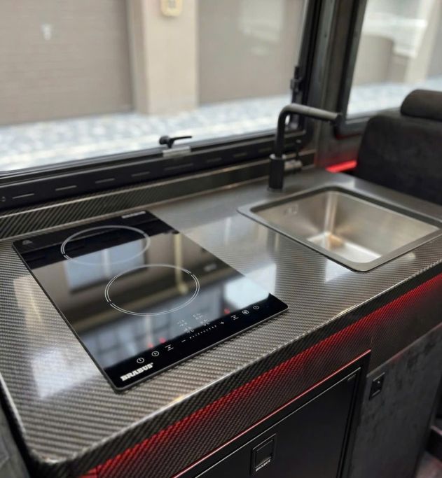 Theo các hình ảnh được công bố, khoang nội thất của chiếc xe mang phong cách sang trọng với chất liệu Alcantara đen và sợi carbon bao phủ khắp nơi, từ cửa nhà vệ sinh đến bệ bếp. Không gian bên trong được mô phỏng vô cùng rộng rãi, vượt xa kích thước thực tế của dòng G-Class.