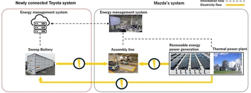 Hiện tại, nhà máy ở Hiroshima đang thử nghiệm hệ thống lưu trữ năng lượng mang tên Sweep, do Toyota phát triển. Công nghệ này tận dụng pin đã qua sử dụng từ xe hybrid và xe điện. Thay vì bị bỏ đi khi dung lượng suy giảm hoặc sau tai nạn, những bộ pin này sẽ được tái sử dụng như “bình chứa điện”, giúp nhà máy tích trữ và cung cấp lại năng lượng khi cần.