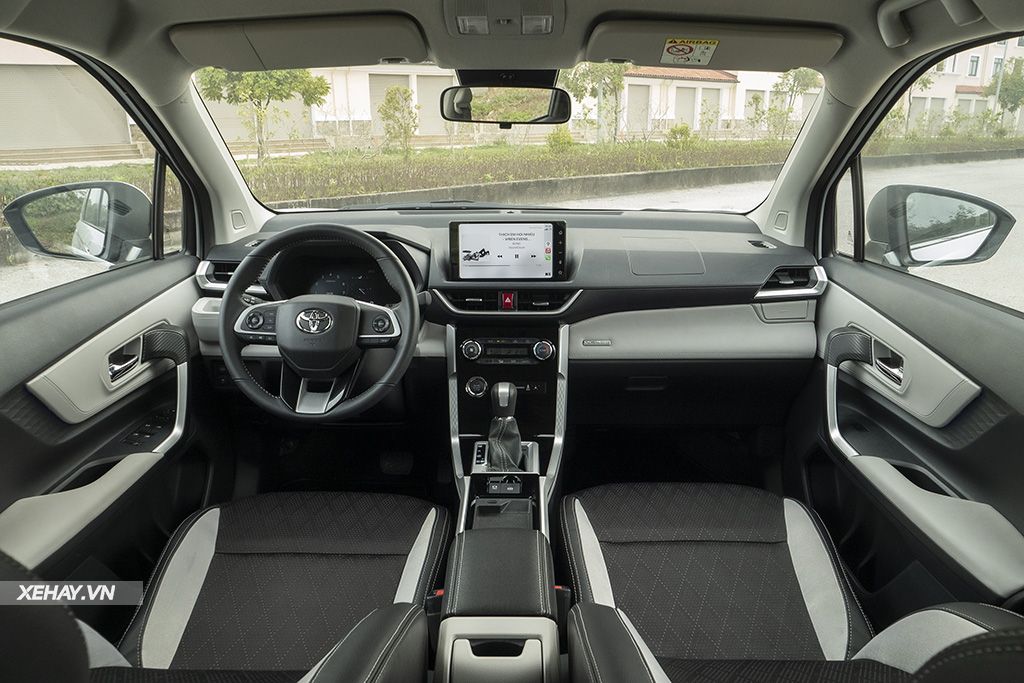Bước vào trong cabin, Toyota Veloz Cross 2022 có cấu hình 7 chỗ ngồi với các hàng ghế được bọc da pha nỉ. Hàng ghế thứ 2 có thể trượt, ngả 60:40, trong khi đó hàng ghế cuối có thể gập 50:50 để gia tăng cốp chứa đồ lên 498L. Tương tự như ngoại thất, các đường nét bên trong cabin cũng cứng cáp và vuông vức, tạo nên một tổng thể khỏe khoắn.
