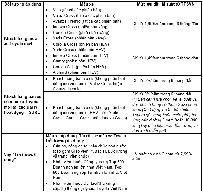 Lưu ý: Thông tin và điều kiện áp dụng chi tiết của chương trình ưu đãi lãi suất của TFSVN trong tháng 12/2025, Quý khách hàng vui lòng tham khảo thông báo từ TFSVN hoặc liên hệ các Đại lý Toyota trên toàn quốc để được tư vấn.