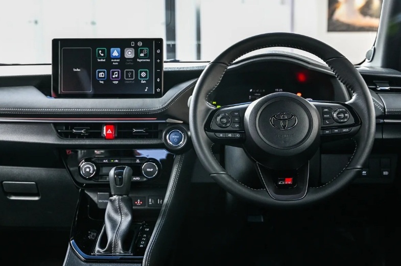 Bên trong khoang lái của Toyota Vios Hybrid 2025 được nâng cấp với màn hình giải trí cảm ứng 10,1 inch hỗ trợ kết nối Apple CarPlay/Android Auto không dây, bảng đồng hồ kỹ thuật số, ghế da pha nỉ, điều hòa tự động, đèn viền nội thất và sạc không dây.