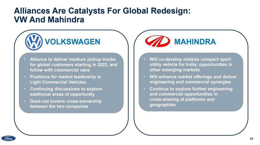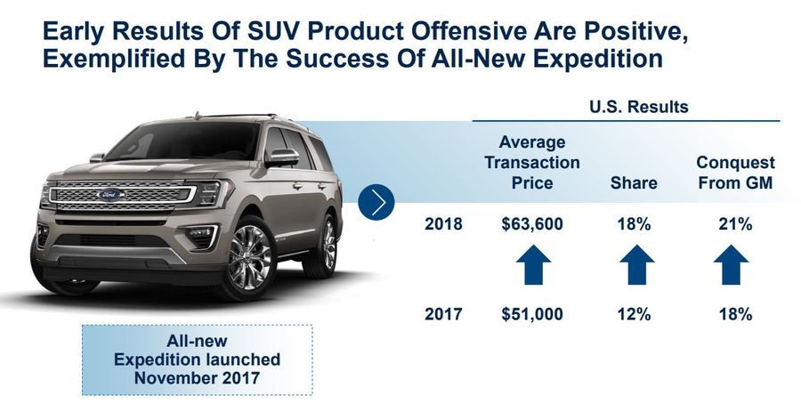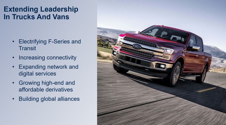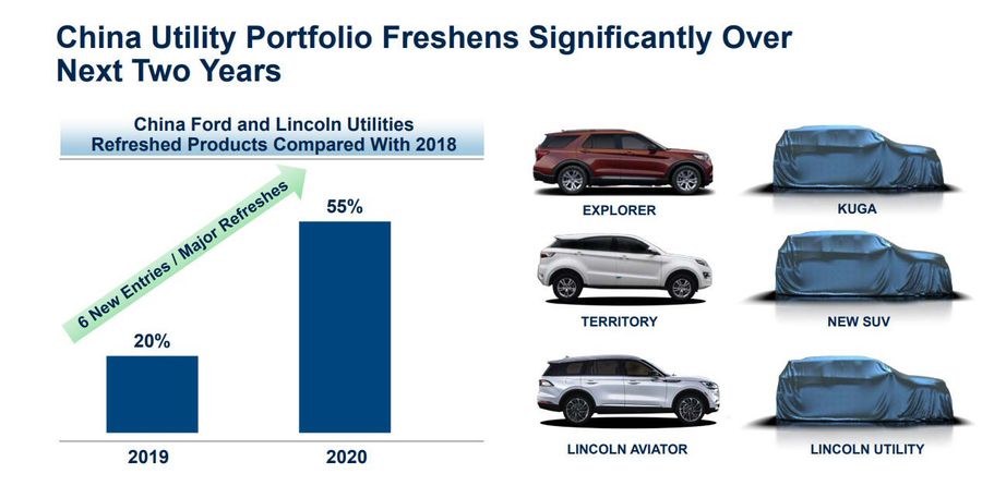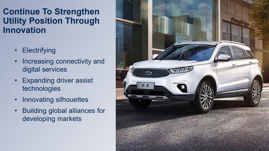 Song song với việc mở rộng sản phẩm, Ford cũng sẽ tăng cường các dòng crossover/SUV và xe tải với công nghệ điện hóa, tăng kết nối và các quan hệ đối tác mới. Những chiếc xe tiện ích gầm cap sẽ có thêm nhiều công nghệ hỗ trợ lái xe, trong khi xe tải sẽ có thêm nhiều sản phẩm phái sinh cao cấp và giá cả phải chăng hơn.