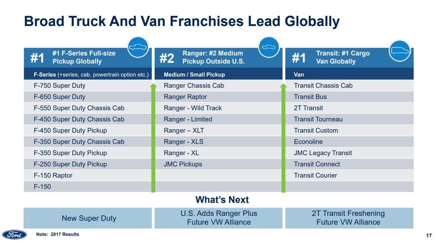 Hiện tại, hãng xe Mỹ đang làm việc trên F-Series Super Duty mới, Ranger cũng đang đến các đại lý ở Hoa Kỳ và Ford đã lên kế hoạch cho nhiều mẫu xe bán tải mới được phát triển cùng với Volkswagen. Với việc tập tung mạnh vào crossover/SUV và xe tải, Ford đang dần loại bỏ dòng sedan khỏi danh mục đầu tư của thương hiệu.