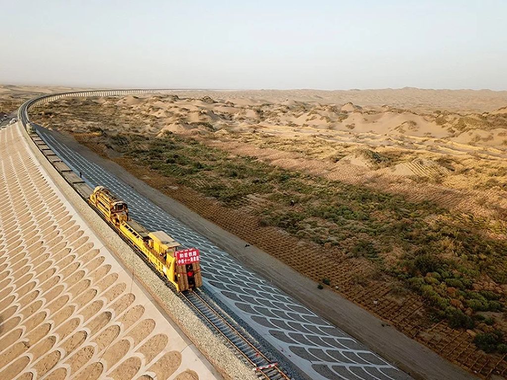 Để xây dựng đoạn đường sắt đi qua khu vực cát chảy, các kỹ sư đã xây dựng 5 cây cầu với tổng chiều dài 49,7km để tàu chạy phía trên, tách biệt với địa hình cát phía dưới. Ngoài ra, 50 triệu mét vuông lưới cỏ và 13 triệu cây ưa cát như cây hắc mai biển đã được trồng để bảo vệ đường sắt.
