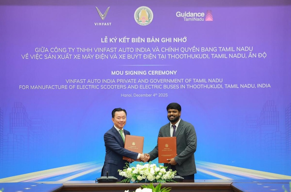 VinFast và Chính quyền bang Tamil Nadu chính thức ký kết Biên bản ghi nhớ hợp tác (MOU) về việc phân bổ khoảng 200 ha đất tại Khu công nghiệp SIPCOT, thành phố Thoothukudi, để mở rộng cơ sở hiện có của công ty.