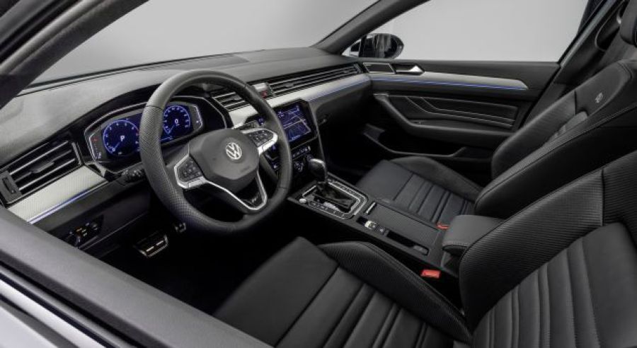 Ở bên trong, xe có các ghế thể thao R-Line, phần trung tâm của lưng ghế được bọc da Nappa, kết hợp với hai bên bọc da kiểu hoạt tiết sợi carbon. Bộ bàn đạp bằng thép không gỉ được đánh bóng, bệ cửa có logo R-Line cũng làm bằng thép không gỉ và hệ thống chiếu sáng nội thất với nhiều màu sắc khác nhau là những điểm nhấn đáng chú ý khác.