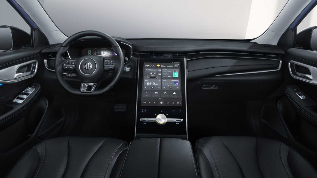 Trái ngược với ngoại hình ấn tượng, bên trong khoảng cabin của MG Marvel R Electric 2021 lại có thiết kế mờ nhạt hơn, ngoại trừ bộ màn hình giải trí với kích thước lên tới 19,4 inch đặt dọc ngay giữa khu vực trung tâm. Với bộ màn hình kích cỡ khủng này, người dùng có thể dễ dàng điều khiển các chức năng của xe hay kết nối với điện thoại thông minh... Ngoài ra, xe còn được trang bị màn hình LCD 12,3 inch cho cụm đồng hồ công-tơ-mét, ghế bọc da kèm chỉ khâu tương phản, đèn viền nội thất...