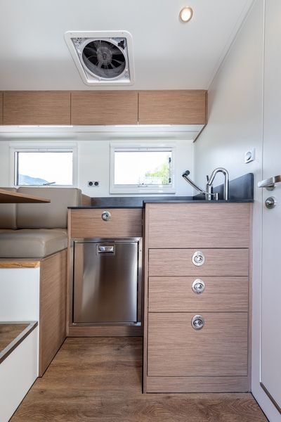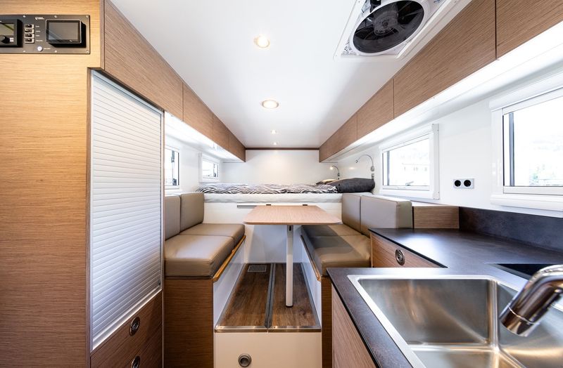 Nói về tiện nghi, "ngôi nhà off-road" này có đầy đủ những thứ cần thiết để sinh sống như bếp từ cảm ứng kép, tủ lạnh dung tích 90 lít, tủ đông 9,8 lít, bồn rửa bằng thép không gỉ, phần mở rộng ở mặt bếp có thể gập gọn và gường đôi.