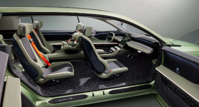 Nội thất của xe mang phong cách tối giản và tập trung vào trải nghiệm người dùng. Màn hình trung tâm đặt dọc kiểu “floating”, vô-lăng mảnh, các nút vật lý cho các thao tác thường dùng, cùng cách bố trí mở rộng không gian cho cả ba hàng ghế. Dù concept sử dụng cửa mở ngược và ghế trẻ em tích hợp giữa khoang lái, nhưng các chi tiết này khó xuất hiện trên phiên bản sản xuất nhằm đảm bảo tính thực tiễn.