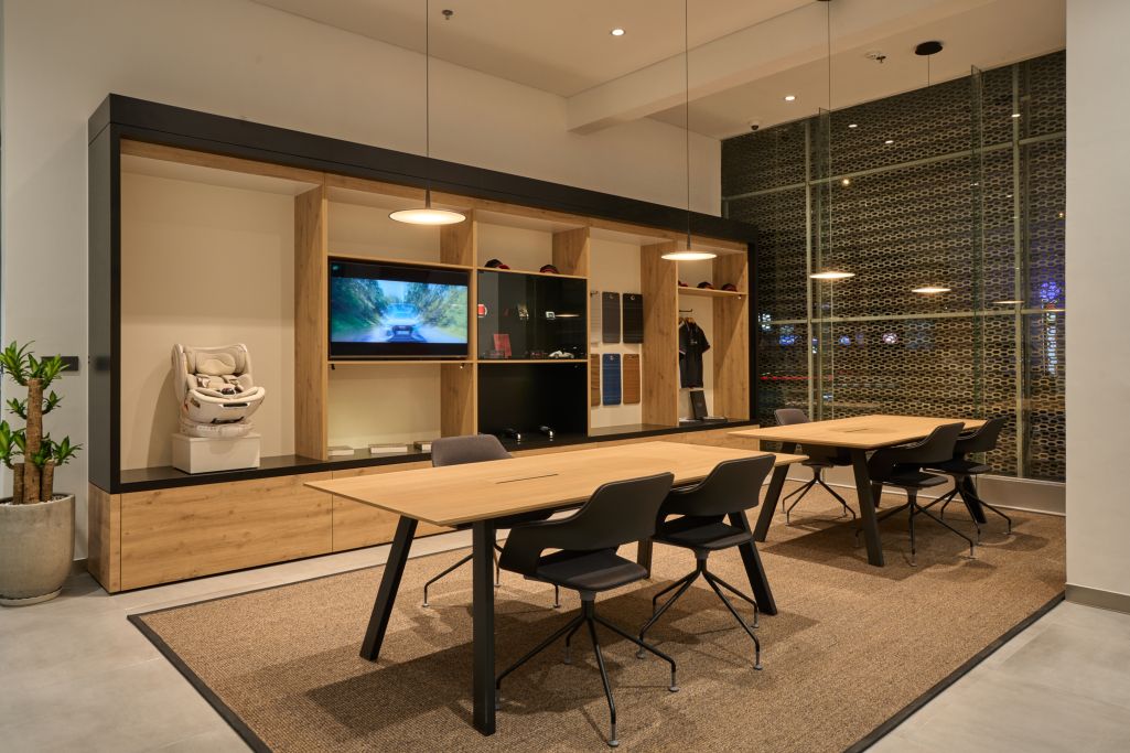 Thay cho quầy tiếp đón truyền thống, khách hàng được chào đón bởi các nhân viên tại bàn tiếp đón thiết kế mở rộng lớn. Cách bố trí này nhằm mang lại cảm giác thân thiện và thoải mái ngay từ khoảnh khắc đầu tiên bước vào showroom. Các khu vực tư vấn cũng được tích hợp trực tiếp trong không gian trưng bày, với nội thất cao cấp và hệ thống ánh sáng được thiết kế tinh tế, tạo nên một trải nghiệm thương hiệu hoàn toàn mới.