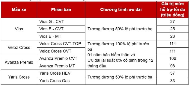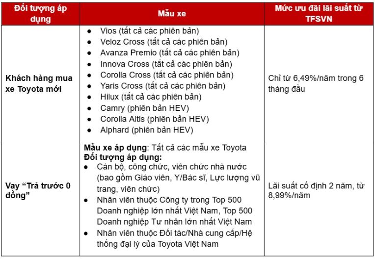 Lưu ý:  Để được tư vấn về Thông tin và điều kiện áp dụng chi tiết của chương trình ưu đãi lãi suất của TFSVN trong tháng 4/2026, Quý khách hàng vui lòng tham khảo thông báo từ TFSVN hoặc liên hệ các Đại lý Toyota trên toàn quốc.