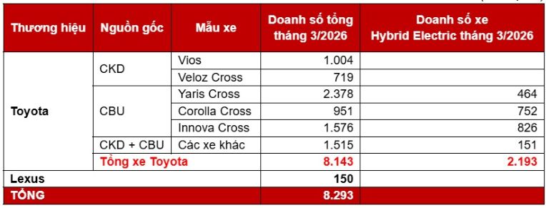 Trong tháng 3/2026, doanh số xe Hybrid Electric của TMV cũng ghi nhận mức tăng trưởng mạnh mẽ với 2.193 xe bán ra và tăng gấp 3 lần so với tháng trước. Kết quả tích cực này cho thấy xu hướng của khách hàng Việt Nam đang tích cực chuyển dịch sang dòng xe Hybrid Electric với nhiều lợi ích như tiết kiệm nhiên liệu nhất là trong giai đoạn giá xăng dầu tang trong thời gian gần đây hay sự thân thiện với môi trường mà không thay đổi thói quen sử dụng của người tiêu dùng.