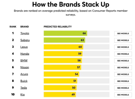 Ở nhóm đầu bảng, trật tự gần như không thay đổi. Toyota, Subaru và Leuxs tiếp tục giữ ba vị trí cao nhất, khẳng định thế mạnh truyền thống về độ bền và tính ổn định. Theo sau là Honda và BMW, hoàn thiện nhóm năm thương hiệu được đánh giá cao nhất năm nay.