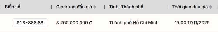 Sau thời gian đấu giá chính thức cùng nhiều lượt gia hạn, biển số đã được một tài khoản trả 3,26 tỷ đồng, trở thành mức giá cao nhất của phiên. Toàn bộ cuộc đấu kéo dài 25 phút với tổng cộng 10 vòng gia hạn.