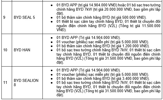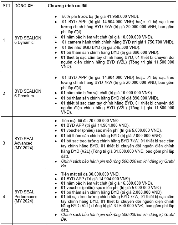 Trong thời gian diễn ra chương trình, từ nay đến hết ngày 30 tháng 11 năm 2025, khách hàng mua một trong các mẫu xe năng lượng mới BYD ATTO 2, BYD ATTO 3, BYD SEAL 5, BYD M6, BYD SEALION 6, BYD SEAL, BYD HAN, BYD SEALION 8 sẽ được hưởng ưu đãi hấp dẫn, từ tiền mặt đến quà tặng trang bị đặc biệt dành cho xe.