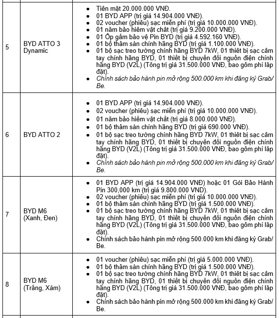 Bên cạnh những ưu đãi từ BYD Việt Nam, khách hàng khi mua tất cả dòng xe được BYD Việt Nam phân phối sẽ nhận được ưu đãi vay đến 90% (JACCS) hoặc 85% (VPBank), lãi suất vay chỉ từ 7,65%/năm. Đặc biệt, các dòng xe BYD ATTO 2, BYD ATTO 3, BYD M6 và BYD SEAL còn được áp dụng thêm chính sách hợp tác giữa BYD và Grab/ Be, nâng thời gian bảo hành pin lên mức 500.000 km.