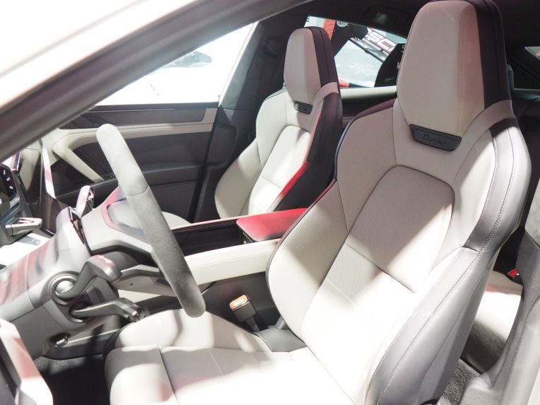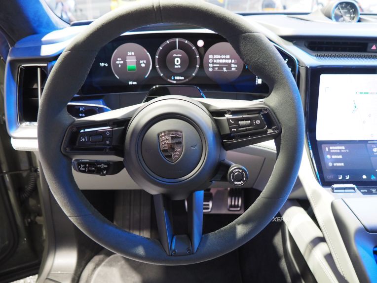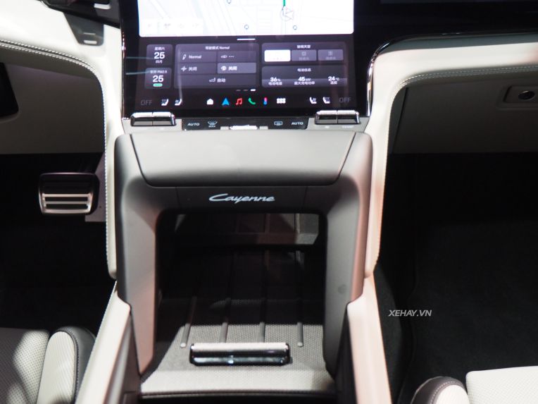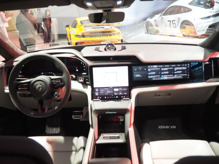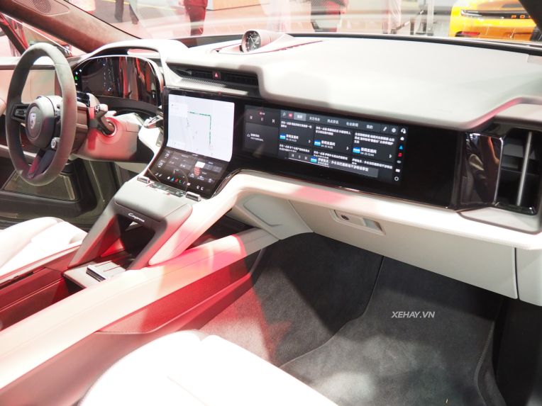 Khoang cabin của Cayenne điện mang hơi hướng hiện đại với đồng hồ taplo kỹ thuật số OLED 14,25 inch và màn hình trung tâm cảm ứng dạng cong. Porsche cũng cung cấp thêm tùy chọn màn hình 14,9 inch dành riêng cho ghế phụ.