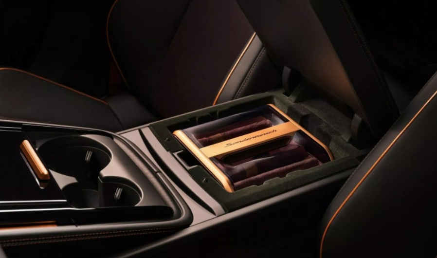 Chủ nhân chiếc xe cũng đưa ra một loạt yêu cầu đặc biệt khác. Trong đó nổi bật là hộp giữ ẩm xì gà làm từ gỗ tuyết tùng tích hợp vào bệ tỳ tay trung tâm, giúp duy trì độ ẩm lý tưởng cho những điếu xì gà cao cấp. Ở hàng ghế sau, Porsche bố trí thêm một ngăn làm mát champagne có ánh sáng nội thất, nâng trải nghiệm xa hoa lên một đẳng cấp khác. Khoang hành lý của xe được bọc da hoàn toàn, kết hợp các chi tiết kim loại màu đen và điểm nhấn Avium Metallic, tạo nên sự thống nhất trong phong cách thiết kế.