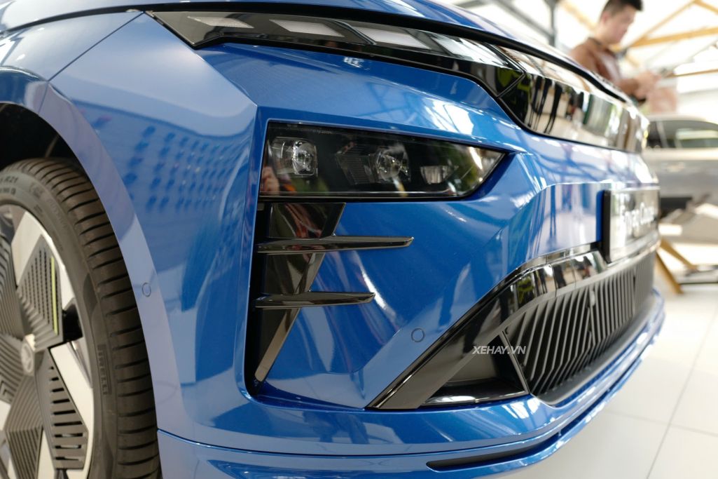 Skoda Enyaq 2025 gây ấn tượng với thiết kế hiện đại, mạnh mẽ nhưng vẫn mang đậm phong cách đặc trưng của hãng. Phần đầu xe nổi bật với “khuôn mặt bốn mắt” gồm 36 phân đoạn LED, tạo hiệu ứng thị giác đặc trưng cho dòng SUV Skoda.