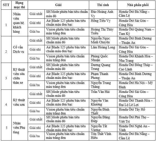 Sau một ngày thi trọn vẹn dưới đánh giá công tâm của Ban giám khảo, vòng Chung kết Hội thi Nhân viên dịch vụ khách hàng xuất sắc đã tìm ra 15 gương mặt xuất sắc nhất cho 5 hạng mục thuộc các Nhà Phân phối. Cụ thể như sau: