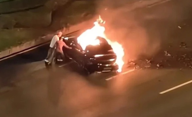 Nhân chứng cho biết, chiếc xe bùng cháy ba lần trong vòng năm phút. Video tại hiện trường ghi lại cảnh nhiều người cố gắng kéo cửa bên lái, dùng cùi chỏ đập kính, thậm chí đạp mạnh vào cửa nhưng đều bất lực.