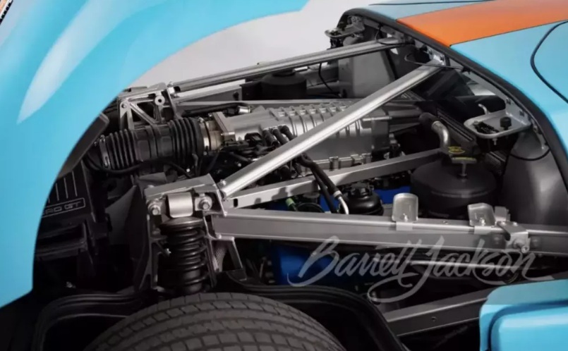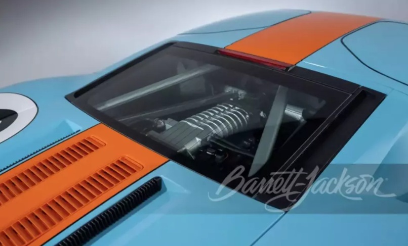 Chiếc GT Heritage khoác lên mình tông màu Gulf Blue và Orange huyền thoại, đi kèm các chi tiết đặc trưng như sọc đua cam, vòng tròn trắng và huy hiệu di sản, khác biệt hoàn toàn so với các mẫu Ford GT tiêu chuẩn.