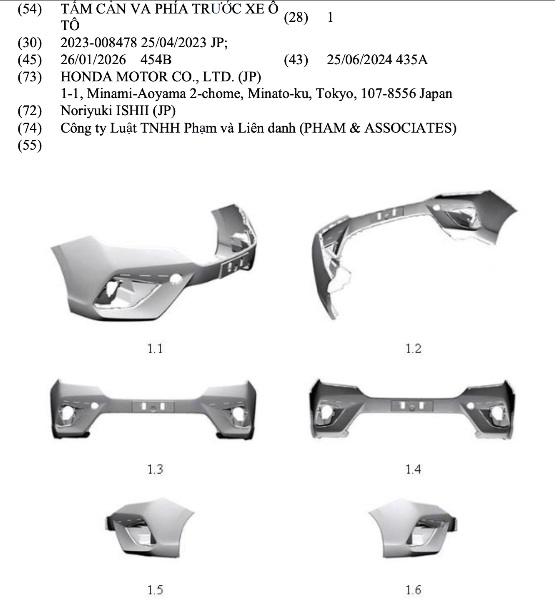 Thông tin từ Công báo sở hữu công nghiệp số mới nhất vừa hé lộ hai chi tiết ngoại thất quan trọng được đăng ký dưới tên Honda, bao gồm cản trước và ốp cản sau ô tô.